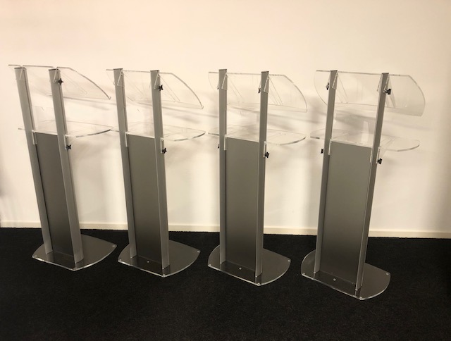 De Katheder/ Lessenaar/ Spreekstoel wordt vaak gebruikt bij presentaties, ceremonies, kerkdiensten en toespraken op scholen. De katheder/ lessenaar/ spreekstoel is gemaakt van glashelder en antracietgrijs acryl ( Plexiglas ) in combinatie met twee aluminium staanders. De twee plateau’s zijn traploos instelbaar en in een handomdraai op de gewenste hoogte te brengen. Tevens is er een mogelijkheid om op formaat 24 cm x 15 cm (BxH) een logo aan te brengen in het venster tussen de 2 staanders en de 2 plateau’s.